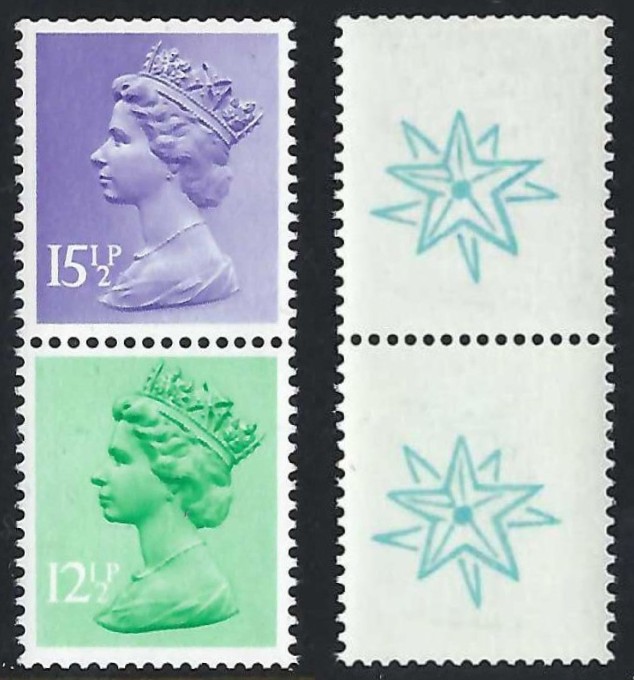 1982 SG X898 12½p light emerald (cb) and SG 907 15½p pale violet (2b) each with star underprint in vertical se-tenant pair, both with variety “phosphor omitted”.