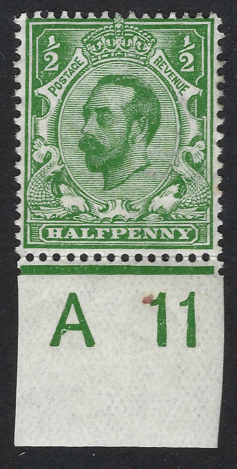 KGV sg321 Spec N1(2) ½d pale green Control A11(w) Perf Type 2 – mounted mint