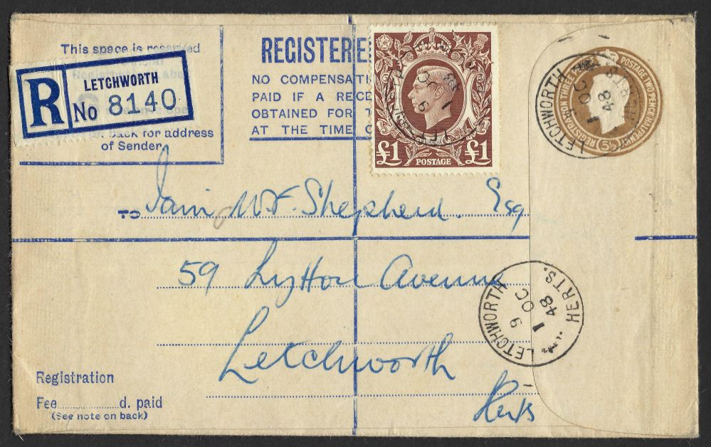 KGVI sg478c £1 brown on Registered First Day Cover to Letchworth
