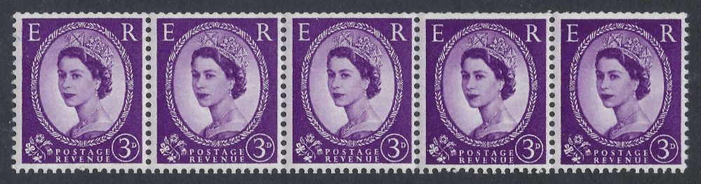 QEII sg545b St Edward`s Crown 3d deep lilac strip (wmk sideways) – unmounted mint