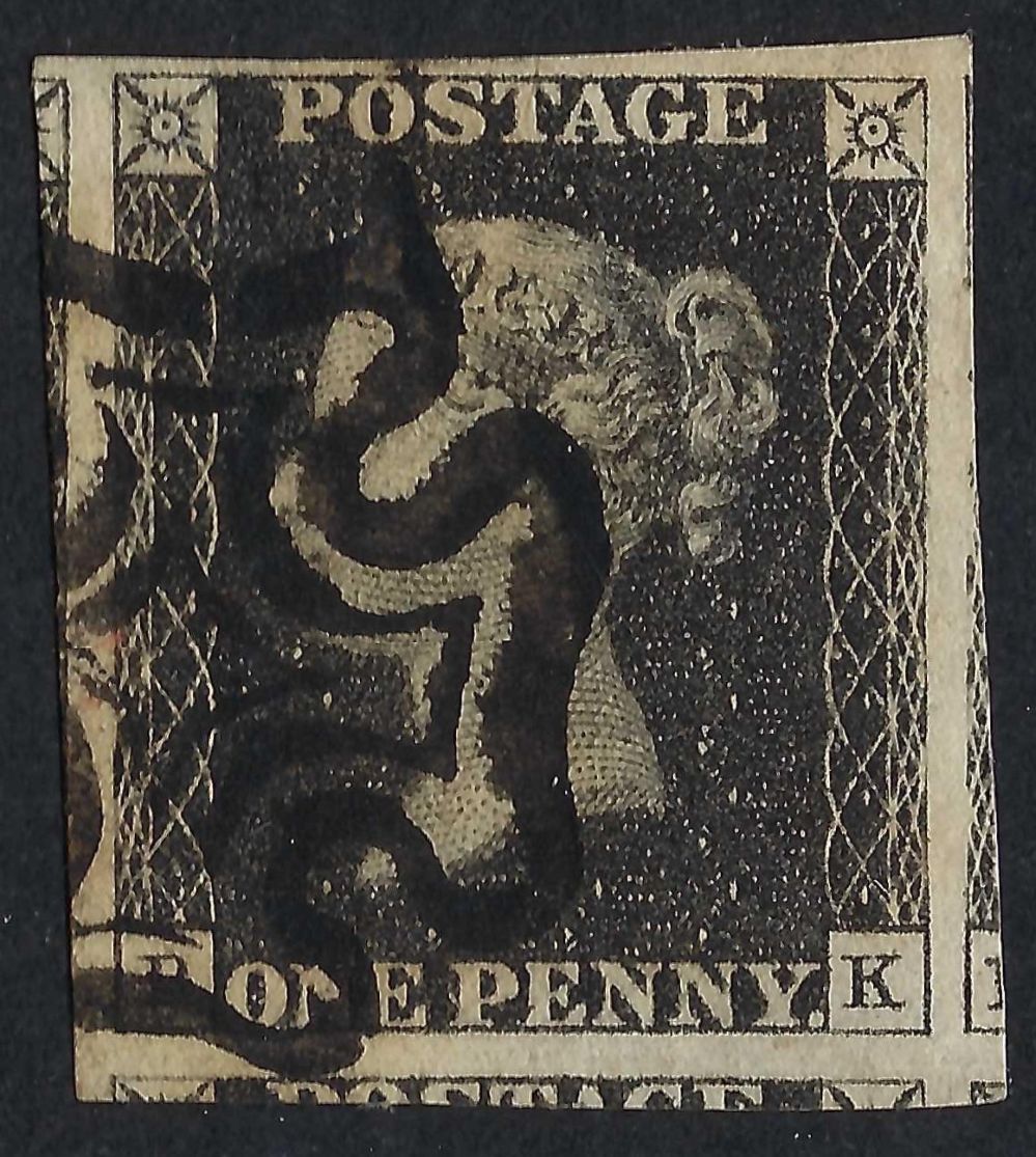 QV 1d black (B-K) plate 7 with good to huge margins and black Maltese Cross