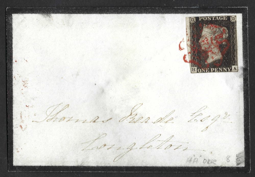 QV sg2 1d black (H-A) Plate 8 showing State 2 of the O flaw with “A” doubled on 1840 mourning envelope from Macclesfield to Congleton