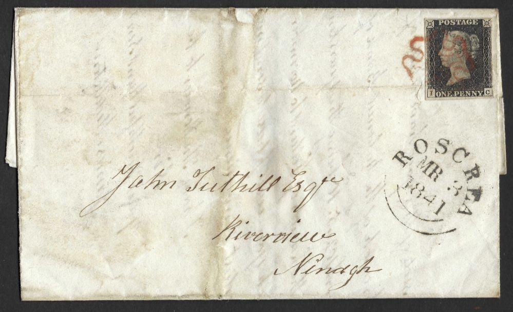 QV sg2 1d black (I-C) Plate 7 on 1841 entire from Roscrea to Nenagh with good margins and red maltese cross