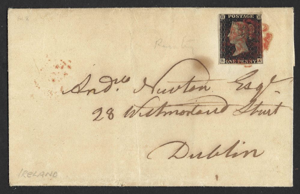 QV sg2 1d black (S-A) Plate 8 showing the “bottom line in SE square extending right”on 1840 part wrapper from Dungannon to Dublin